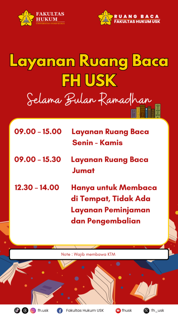 Berdasarkan Surat Edaran Rektor Universitas Syiah Kuala Nomor 4 Tahun 2026 tentang Penyesuaian Sistem Kerja Kedinasan pada Bulan Suci Ramadhan 1447 Hijriah serta dalam rangka Libur Nasional dan Cuti Bersama Hari Suci Nyepi (Tahun Baru Saka 1948) dan Hari Raya Idul Fitri 1447 Hijriah di Lingkungan Universitas Syiah Kuala, bersama ini disampaikan penyesuaian jam layanan Perpustakaan sebagai berikut:
